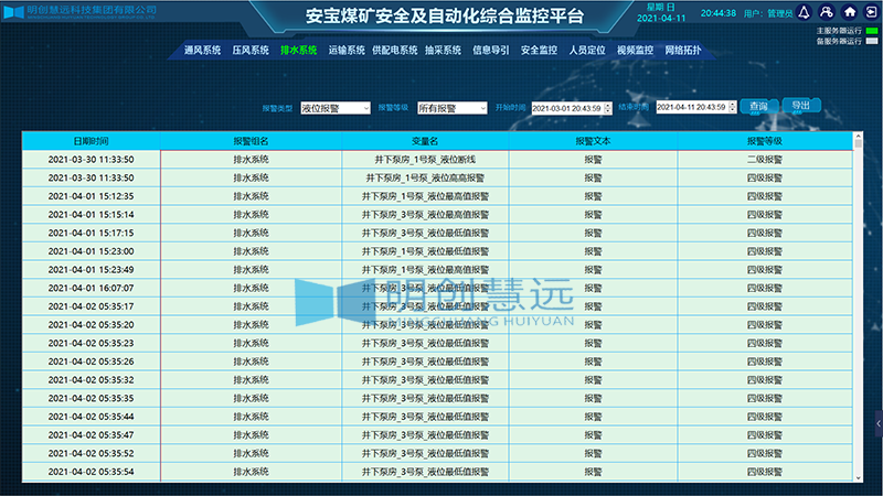- 超标报警:包括对有害气体超标,井下时间过长,超标水位,过低水压,温度超标等。